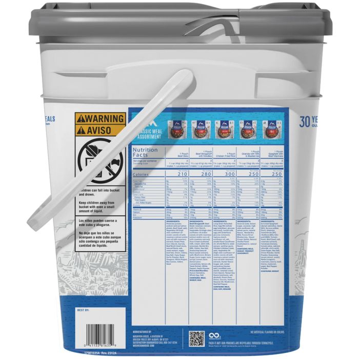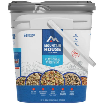Perfect solution for those who want a reliable emergency food supply that doesn't take up a ton of space or for those that want to take it on the next family camping trip. With 24 servings of some of our most delicious options, Mountain House Assortment Buckets are compact and easy to store just about anywhere!