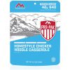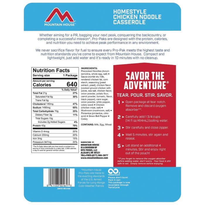 43g Protein and 650 Calories. Compact vacuum pouch. Won't expand in high elevations. Takes up less space in your backpack. Hearty 16 oz. serving. Available in best selling entrees: Beef Stroganoff, Chili Mac, Chicken Noodle Casserole, Mexican Adobo Rice and Chicken.
